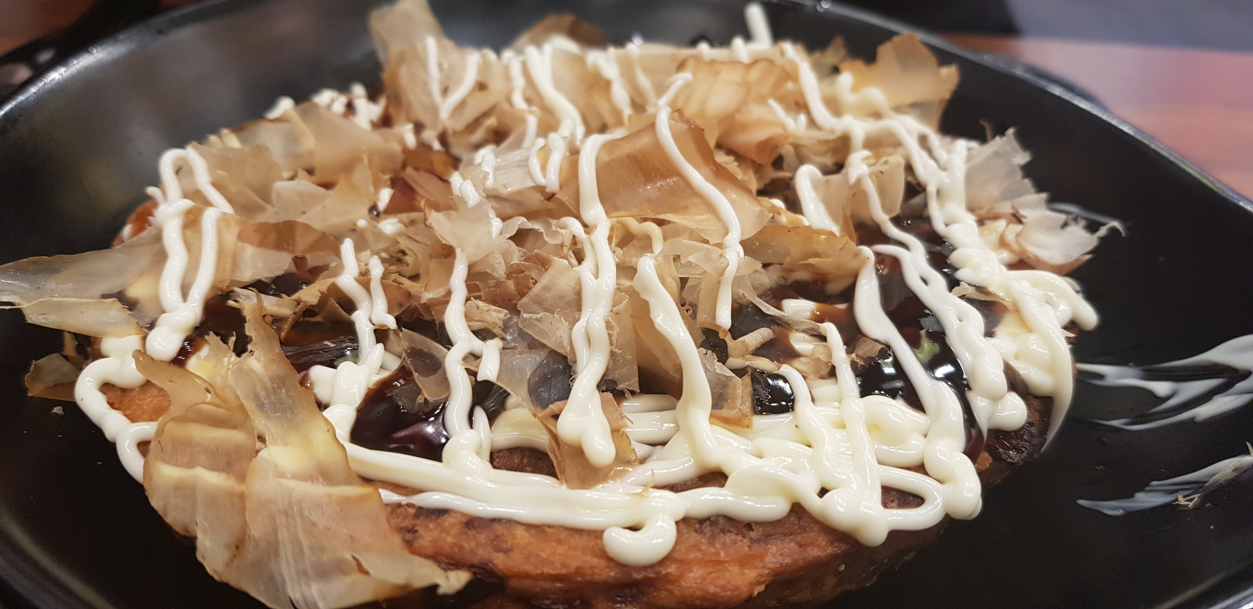 다른 메뉴를 또 주문할지는 모르겠지만 오꼬노미야끼를 이렇게 집 가까운데에서 싼 값에 먹을 수 있다는 것은 기쁜 일이지요. 오꼬노미야끼와 자비없는 마요네즈 소스, 그리고 춤을 추는 가쓰오부시는 침샘을 마구 자극합니다.