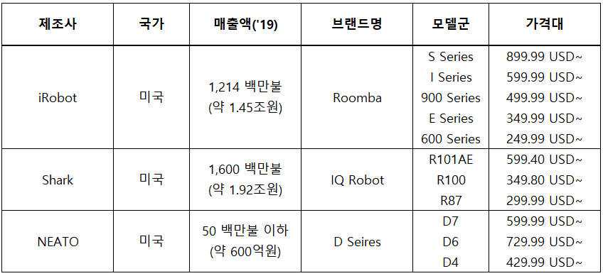 먼저 글로벌로 보면 미국은 단연 iRobot 입니다. 이외에도 SHARK, NEATO 등도 로봇청소기 시장에 참여중입니다.