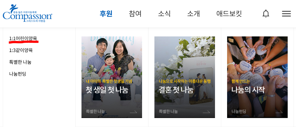 그 다음은 [후원] - [1:1 어린이 양육]을 클릭해볼까요?