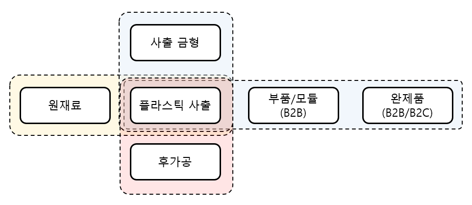 플라스틱 사출산업은 다양한 전/후방 산업으로 구성되어 있습니다. 모델을 조금 도식화 시켜 본다면 플라스틱 사출기업의 사업구조는 다음 모델 중 하나이거나 몇 가지를 중첩해서 사업을 영위하고 있다고 볼 수 있습니다. 이외에도 전장/회로 업종 등 타업종과의 융복합도 있겠지만 그것은 우선 논외로 하겠습니다.