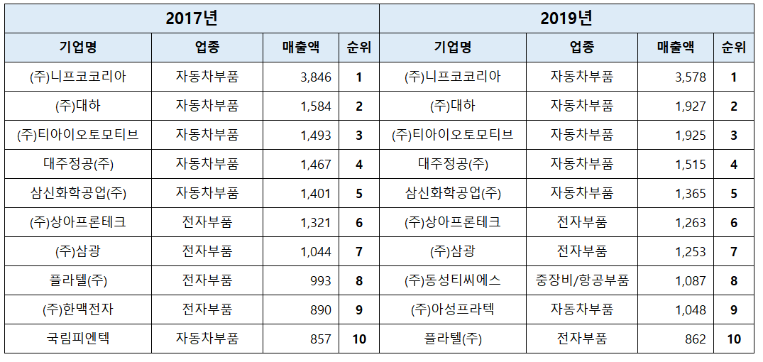 ▷ 사출 + 부품 : 니프코코리아(엔지니어링 플라스틱 사출 → 자동차/전자 부품), 티아이오토모티브(사출 → 자동차 부품) 등