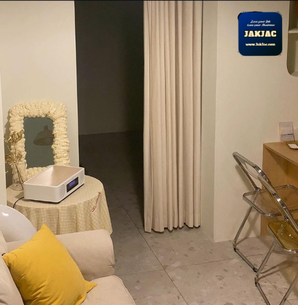 촬영 공간은 커튼으로 분리된 프라이빗 존이며, 대기 공간에는 쇼파와 사진 편집 멫 상담용 테이블이 준비돼 있습니다.